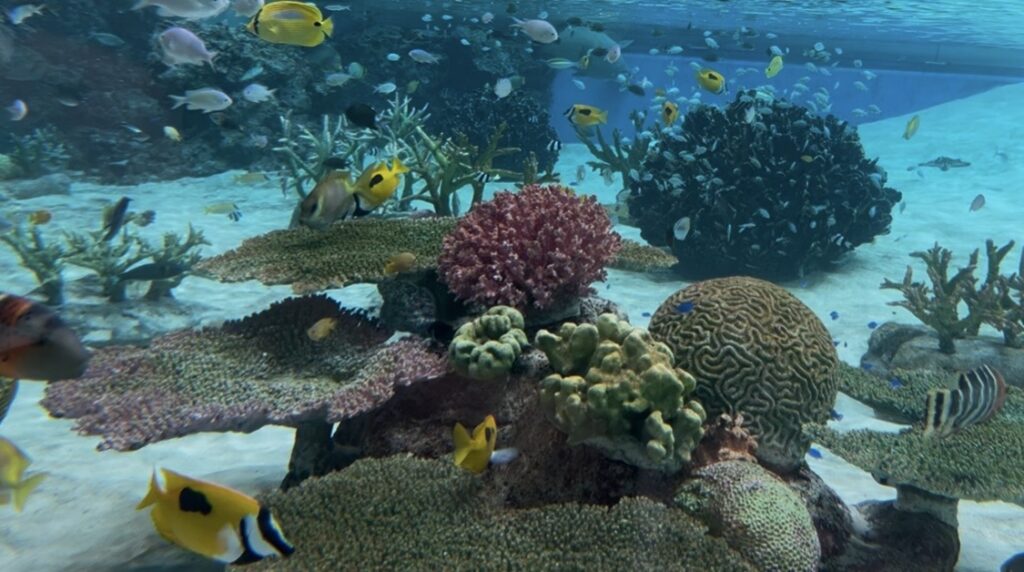 まず驚いたのが水槽の透明度。ライトの当たり方も含めて本当にガラスがないみたいにクリアに見えて、魚たちが目の前を泳ぐ迫力がすごい!